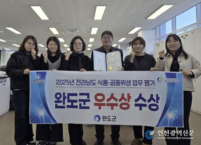 [인천광역신문] 박진 기자 | 완도군은 전라남도에서 실시한 '2025년 식품·공중위생 업무 평가'에서 ‘우수상’을 수상했다.