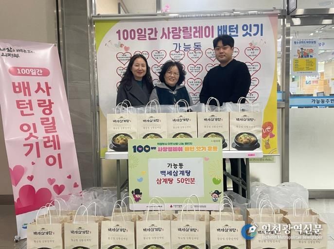 [인천광역신문] 박진 기자 | 의정부시 가능동주민센터는 12월 22일 백세삼계탕이 ‘100일간 사랑릴레이 배턴 잇기’에 동참해 관내 노인들을 위해 삼계탕 50인분을 기탁했다고 밝혔다.
