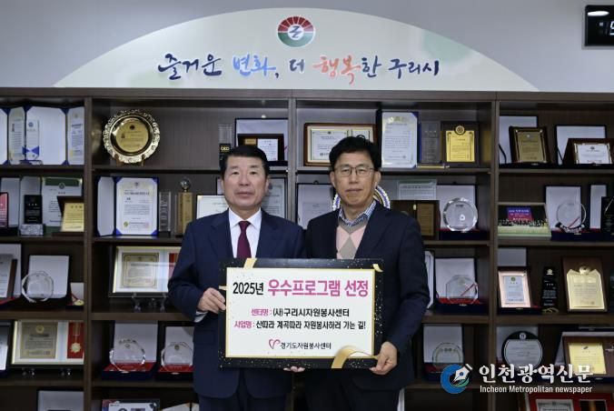 [인천광역신문] 박진 기자 | 사단법인 구리시자원봉사센터는 12월 22일, 경기도자원봉사센터 공모사업인 ‘2025 지역맞춤형 지원사업’ 시군 네트워크 분야에서‘산 따라 계곡 따라, 자원봉사 하러 가는 길!’ 프로그램이 우수사업으로 선정됐다고 밝혔다.