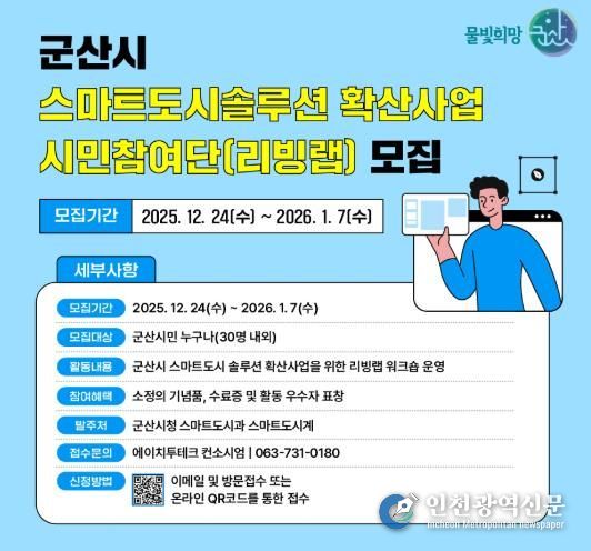 [인천광역신문] 박진 기자 | 군산시가 국토교통부 주관 ‘스마트도시 솔루션 확산사업’ 추진의 하나로 시민이 직접 참여해 문제를 진단하고 개선방안을 도출하는 ‘스마트도시 솔루션 확산사업 리빙랩 시민참여단’을 2026년 1월 7일까지 모집한다.
