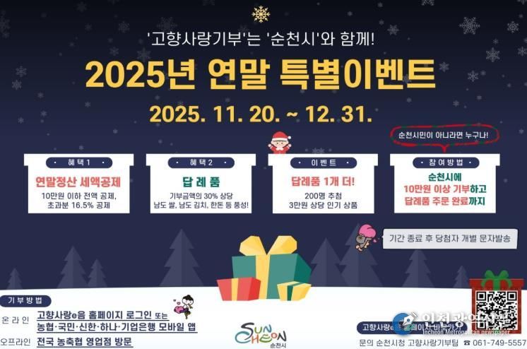 [인천광역신문] 박진 기자 | 순천시가 고향사랑기부제 활성화와 연말정산 혜택을 위해 실시 중인 ‘고향사랑기부제 연말 특별이벤트’ 홍보에 나섰다.