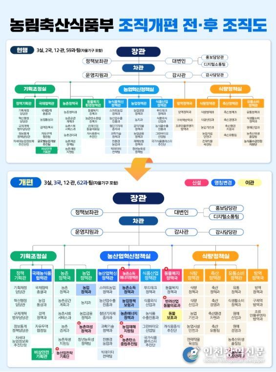 [인천광역신문] 박진 기자 | 농림축산식품부는 농정을 혁신하고 국민주권정부의 농정 비전인 ‘국민과 함께하는 농업, 희망을 실현하는 농촌’ 조기 구현을 뒷받침하기 위해 조직을 확대․개편한다.