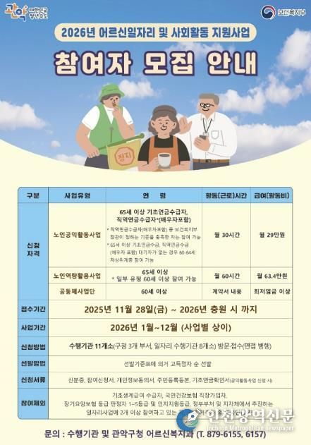 [인천광역신문] 박진 기자 | 관악구가 초고령시대 진입을 앞두고 어르신들의 사회참여 증진과 노후 소득 보장을 위해 ‘2026년 노인일자리 및 사회활동 지원사업’을 대폭 확대 추진한다.