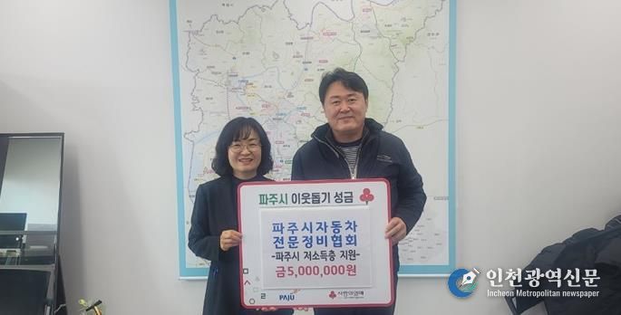 [인천광역신문] 박진 기자 | 파주시는 지난 22일, 파주시자동차전문정비협회가 파주시청을 방문하여 관내 취약계층을 위해 써달라며 현금 5백만 원을 기탁했다고 밝혔다.