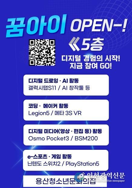 [인천광역신문] 박진 기자 | 서울 용산구는 인공지능(AI)과 디지털 시대를 선도할 미래 인재를 양성하기 위해, 용산꿈나무종합타운(백범로 329) 내 청소년 전용 디지털 공간인 ‘꿈아이 인공지능(AI) 디지털체험실’을 조성하고, 12월부터 시범운영을 시작했다고 밝혔다.