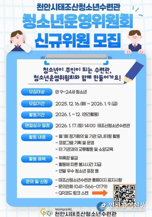 [인천광역신문] 박진 기자 | (재)천안시청소년재단 천안시태조산청소년수련관은 내년 1월 9일까지 2026년 청소년운영위원회 신규 위원을 모집한다고 24일 밝혔다.