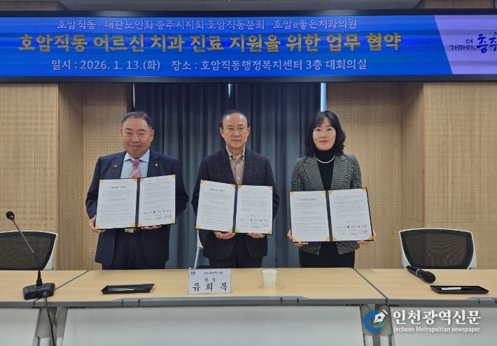 [인천광역신문] 박진 기자 | 충주시 호암직동행정복지센터(동장 김민남)는 13일 대한노인회 충주시지회 호암직동분회(분회장 유덕상), 호암e좋은치과의원(원장 유희복)과 관내 어르신들의 건강 증진과 의료 접근성 향상을 위한 진료협력 협약을 체결했다.
