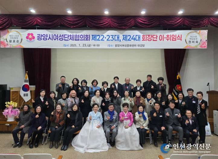[인천광역신문] 박진 기자 | 광양시 여성단체협의회는 지난 1월 23일, 여성문화센터 1층 대강당에서 제 22․23대 회장 이임과 제24대 회장 취임을 기념하는 이·취임식을 성황리에 개최했다.