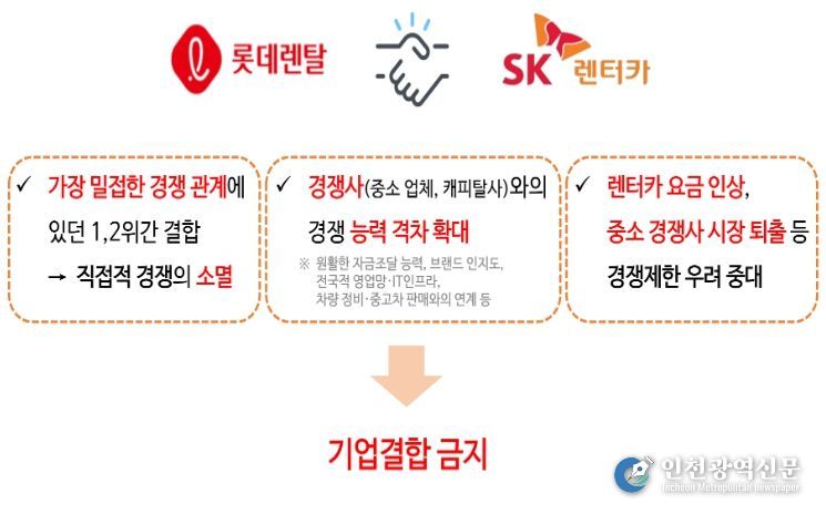 [인천광역신문] 박진 기자 | 공정거래위원회는 사모펀드(PEF) 운용사인 어피니티 에쿼티 파트너스 리미티드가 롯데렌탈 주식회사의 주식 63.5%를 취득하는 기업결합을 심사한 결과, 국내 렌터카 시장의 가격 인상 등 경쟁을 실질적으로 제한할 우려가 크다고 판단하여 해당 결합을 금지하는 조치를 부과했다.