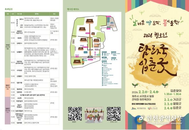 [인천광역신문] 박진 기자 | 제주특별자치도는 2026 병오년 탐라국 입춘굿을 (사)제주민예총(이사장 송맹석) 주최·주관으로 "날 베롱 땅 움짝, 봄이 들썩”주제로 2월 2일부터 2월 4일까지 관덕정, 제주목 관아지 등 도내 일원에서 개최한다고 밝혔다.