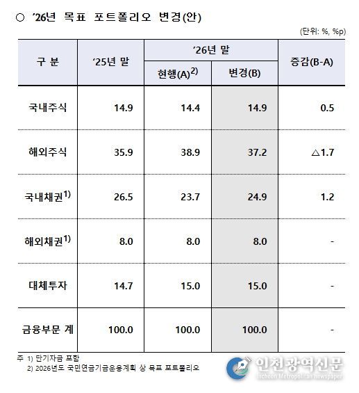 우선 기금위는 기금규모 확대에 따른 외환조달 부담과 최근 수요 우위의 외환시장 환경 등을 고려해 2026년도 기금운용계획상 목표 포트폴리오를 변경하기로 결정했다. 이에 따라 2026년 해외주식 목표비중은 당초 계획인 38.9%에서 37.2%로 조정(△1.7%)되어 당초 계획 대비 절반 이상 축소된다.