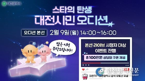 [인천광역신문] 박진 기자 | 대전시는 시민 참여형 홍보 프로젝트인 ‘스타의 탄생! 대전시민 오디션!’의 최종 현장 오디션을 2월 9일 오후 2시, 대전 예술가의 집 누리홀에서 개최한다.