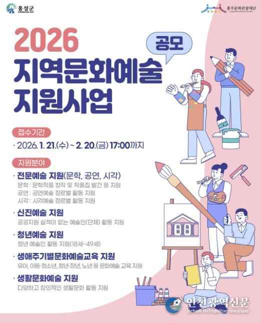[인천광역신문] 박진 기자 | 홍주문화관광재단은 홍성군 예술인과 예술단체의 창작활동을 활성화하고, 군민 문화향유 기회 확대를 위해‘2026년 지역문화예술지원사업’공모를 진행한다.