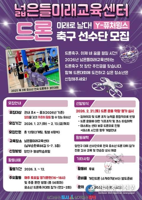 [인천광역신문] 박진 기자 | 양천구는 드론 주행 기술과 스포츠를 결합한 유소년 드론축구단 ‘Y-퓨처윙스’를 창단하고, 하늘 위에서 펼쳐지는 짜릿한 승부를 함께 경험할 창립 멤버를 오는 2월 13일까지 모집한다고 밝혔다.