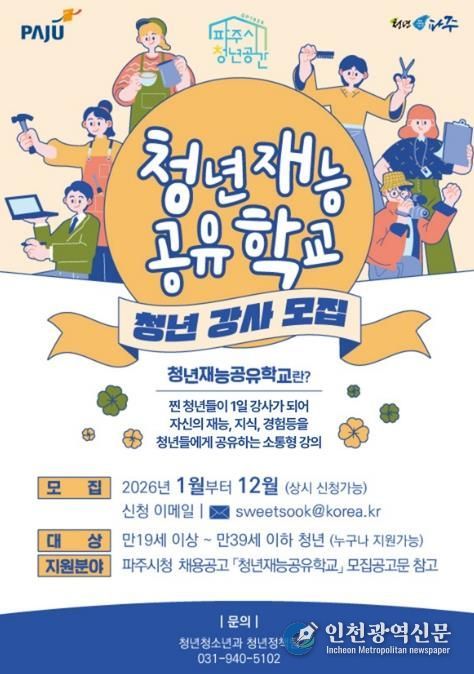 [인천광역신문] 박진 기자 | 파주시는 2026년 1월부터 12월까지 청년을 대상으로 '청년재능공유학교' 청년강사를 연중 상시 모집한다.