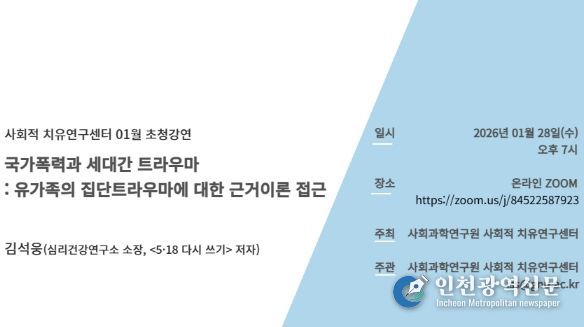 [인천광역신문] 박진 기자 | 경상국립대학교 사회과학연구원(원장 송원근 경제학부 교수)은 1월 28일 오후 7시 김석웅 심리건강연구소 소장을 초청해 ‘국가폭력과 세대 간 트라우마: 유가족의 집단트라우마에 대한 근거이론 접근’이라는 주제로 초청강연회를 개최한다.