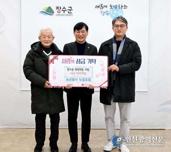 [인천광역신문] 박진 기자 | 장수군은 (유)번암조경이 군청을 방문해 지역의 어려운 이웃을 돕기 위해 이웃돕기 성금 500만원을 기탁했다고 27일 밝혔다.