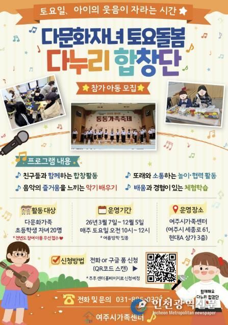 [인천광역신문] 박진 기자 | 여주시가족센터는 여주시의 지원을 받아 다문화가족 자녀를 대상으로 운영한 토요돌봄 프로그램 ‘다누리 합창단’의 2025년도 운영을 성공적으로 마무리하고, 2026년도 프로그램 운영을 재개하며 참여 아동을 모집한다.