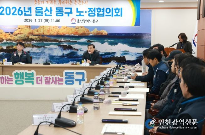 [인천광역신문] 박진 기자 | 울산 동구는 1월 27일 오전 11시 동구청 상황실에서 지역 노동계와 함께하는 ‘2026년 노정협의회’를 개최했다. 이번 회의는 새해 구정 운영 방향을 공유하고 노동 분야 주요 정책을 설명하며, 노정 간 소통과 협력을 강화하기 위해 마련됐다.