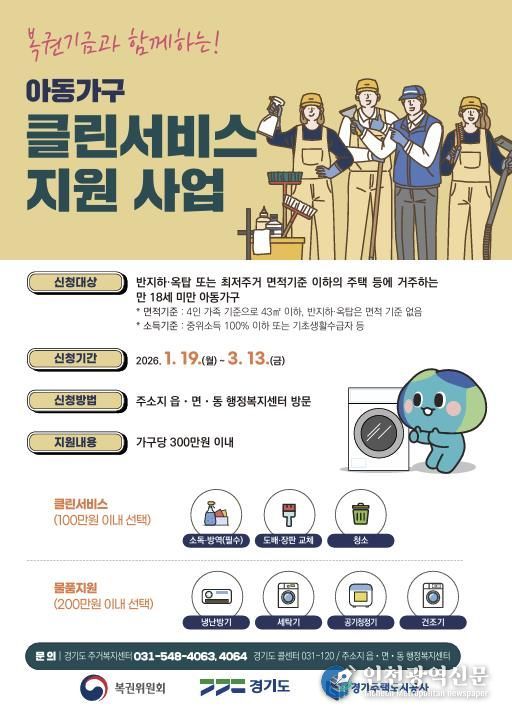 [인천광역신문] 박진 기자 | 안성시는 복권기금과 함께하는 경기도 ‘아동가구 클린서비스 지원사업’ 신청을 1월 26일부터 3월 13일까지 받는다.