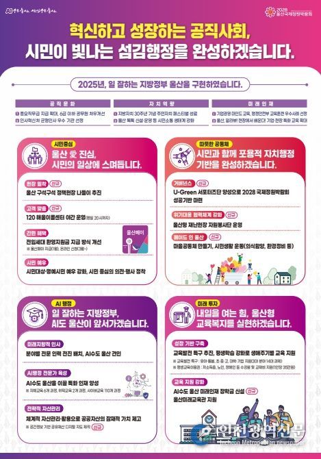 울산시는 ‘인공지능(AI) 수도 울산’에 걸맞은 인재 양성과 미래세대 투자, 시민 중심의 공동체 조성을 위해 ▲울산 애(愛) 진심, 시민의 일상에 스며듦 ▲시민과 함께 포용적 자치행정 기반 완성 ▲일 잘하는 지방정부, 인공지능(AI)도 울산이 앞서감 ▲내일을 여는 힘, 울산형 교육복지 실현 등 4대 전략을 추진한다.