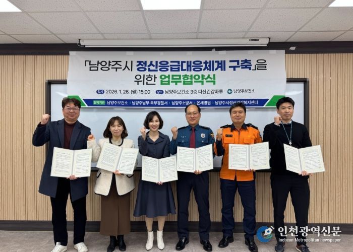 [인천광역신문] 박진 기자 | 남양주시는 지난 26일 남양주보건소 다산건강마루에서 자·타해 위험이 있는 정신응급 환자에 대한 신속하고 체계적인 대응체계를 구축하기 위해 관계기관과 ‘남양주시 정신응급대응체계 구축 업무협약’을 체결했다고 27일 밝혔다.