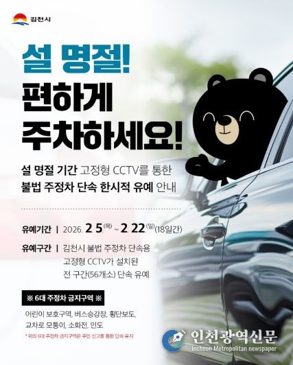 [인천광역신문] 박진 기자 | 김천시는 2026년 2월 5일부터 2월 22일까지 18일간 설 명절 기간 주정차 단속 카메라가 있는 전 구간(56개소)에 대하여, 고정형 카메라를 통한 불법 주정차 단속을 한시적으로 유예한다.