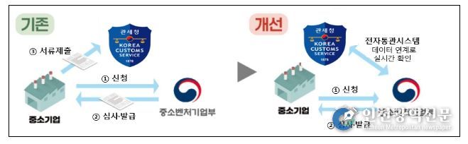 [인천광역신문] 관리자 기자 | 관세청은 수출입 중소기업의 행정 부담을 줄이기 위해 2월 27일(금)부터 세관의 중소기업확인 업무를 디지털 방식의 원스톱(One-Stop) 처리 서비스로 개편·시행한다고 밝혔다.