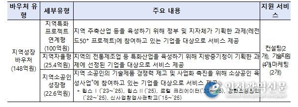 지역성장바우처는 지원 대상에 따라 3가지 유형으로 구분되며, 레전드50+ 프로젝트 참여 기업지역특화연계형(100억원), 지역의 전통 제조업체지역자율형(25.4억원), 기업가형 소상공인 육성사업 참여기업지역소공인성장형(22.6억원)이 주요 지원대상이다.