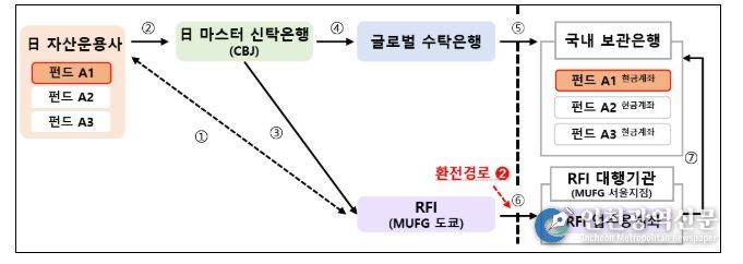 24일 일본 현지의 한 자산운용사는 기존처럼 마스터 신탁은행*(CBJ**)과 글로벌 수탁은행을 통해 결제 정보를 전달하면서도, 원화는 일본 현지의 RFI(MUFG)를 통해 별도로 환전하여, 국내 보관은행에 환전대금을 직접 송금하는 형태의 제3자 환전 시범거래에 성공했다.