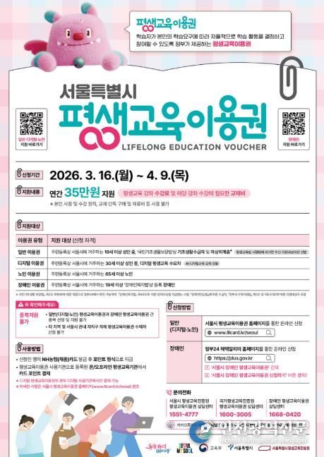 조성명 강남구청장은 “평생교육이용권은 경제적 여건이나 신체적 제약 때문에 배움의 기회를 놓치기 쉬운 구민들에게 다시 학습의 문을 열어주는 제도”라며 “구민 한 분 한 분이 자신의 삶에 필요한 배움을 이어가고, 그 배움이 일상과 일자리, 미래의 가능성으로 이어질 수 있도록 촘촘한 평생학습 지원을 계속해 나가겠다”고 말했다.