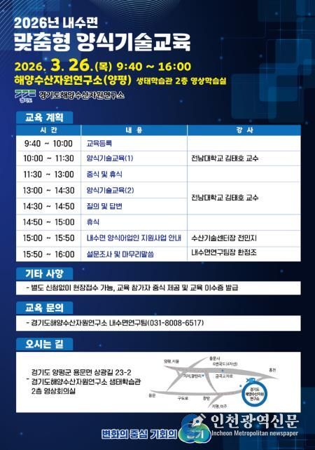 [인천광역신문] 관리자 기자 | 경기도해양자원연구소는 오는 26일 양평에 있는 연구소 생태학습관에서 내수면 양식 어업인의 역량 강화를 위한 양식기술교육을 실시한다.