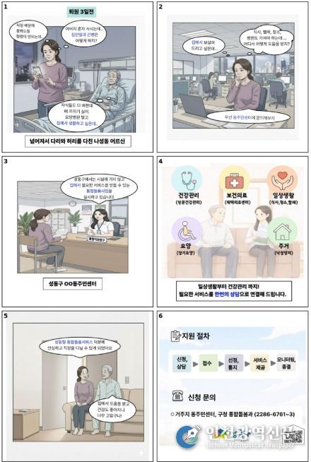 구 관계자는 “돌봄이 필요한 어르신과 가족들이 통합돌봄 사업에 쉽게 접근할 수 있도록 실제 사례를 담은 웹툰 등 다양한 방법을 통해 알리고 있다”며, “앞으로도 성동의 어르신들이 살던 곳에서 더 오래, 더 건강하고 행복하게 생활할 수 있도록 통합돌봄 체계를 지속적으로 강화해 나가겠다”고 말했다.