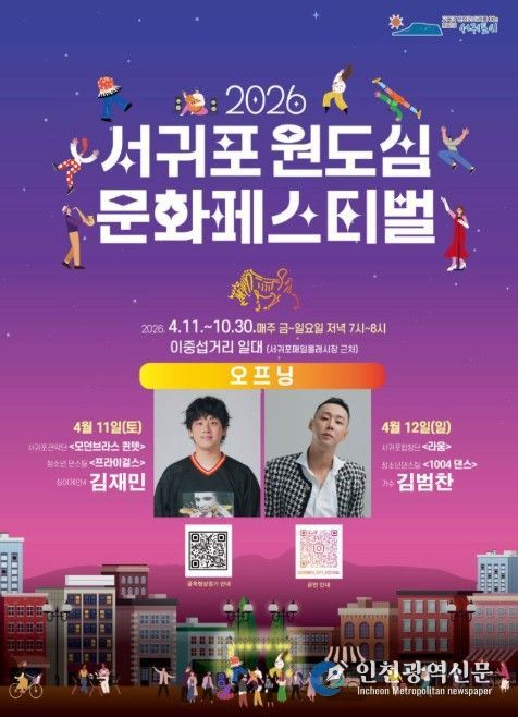 [인천광역신문] 관리자 기자 | 서귀포시는 올해 4월 11일부터 10월 30일까지 매주 금·토·일요일 저녁 7시에 이중섭로 일대에서 대표 상설 야간 문화행사인 `2026 서귀포 원도심 문화페스티벌'을 개최하여, 지역 예술인 및 청소년 동아리 공연 등 다채로운 볼거리를 선보일 예정이다.