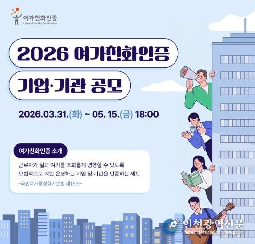 [인천광역신문] 관리자 기자 | 문화체육관광부는 지역문화진흥원과 함께 기업과 기관을 대상으로 3월 31일부터 5월 15일까지 ‘2026 여가친화인증’ 신청을 받는다.