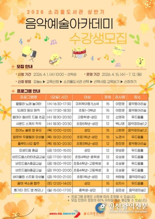[인천광역신문] 관리자 기자 | 오산시 소리울도서관은 시민들의 예술적 감수성을 높이고 일상 속 음악 문화를 확산하기 위해 ‘2026년 소리울도서관 상반기 음악예술아카데미’ 수강생을 모집한다고 밝혔다.