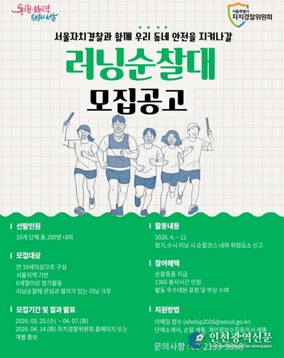 [인천광역신문] 관리자 기자 | 서울시 자치경찰위원회는 러닝을 하며 동네 안전까지 함께 살피는 시민 참여형 활동인 서울 러닝 순찰대에 참여할 2026년 신규 대원을 모집한다. 올해는 10개 단체(크루) 200명 규모로 확대해 운영할 계획이다.