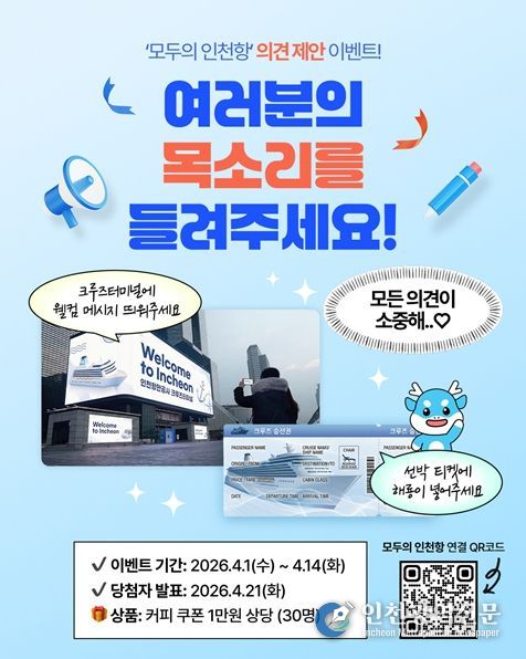 참여 기간은 2026년 4월 1일부터 4월 14일까지 2주간이며, 참여 방법은 인천항만공사 홈페이지 접속 회원가입, 국민소통플랫폼 '모두의 인천항' 내 ‘제안해(海)’ 토론해(海)’ 코너 등을 통해 의견을 남긴 후 인스타그램, 페이스북 네이버블로그 등 SNS 채널의 참여완료 댓글을 작성하면 된다. 추첨을 통해 총 30명에게 소정의 상품을 제공 결과는 4월 21일(화) 공사 홈페이지와 SNS를 통해 발표 예정이다.