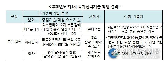 [인천광역신문] 관리자 기자 | 과학기술정보통신부와 한국과학기술기획평가원(원장 직무대행 황지호,)은 ‘2026년도 제1차 국가전략기술 확인 신청’에 대해 총 3건의 기술(디스플레이, 이차전지, 양자 분야)이 국가전략기술에 해당하는 것으로 확인했다.