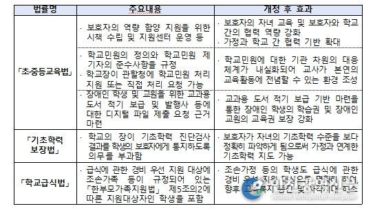 교육부는 이번 법률 개정을 통해 국가와 지방자치단체가 보호자의 역량 함양과 교육 정책에 대한 이해 및 소통을 지원하기 위한 시책을 수립하도록 했다. 또한 학부모 정책 추진을 위한 실태조사와 함께 보호자 교육에 행정·재정적 지원을 할 수 있는 근거를 마련했다. 아울러 보호자 교육과 보호자의 학교 참여 등에 대한 정보를 제공하는 전국‧지역 학부모지원센터의 설치·운영 근거도 신설했다.