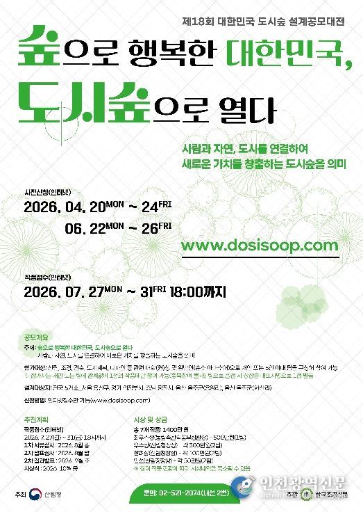 [인천광역신문] 관리자 기자 | 산림청(청장 박은식)은 도시숲의 가치와 역할에 대한 국민의 관심을 제고하고, 미래 도시숲 설계 인재를 양성하기 위한 ‘제18회 도시숲 설계공모대전’을 개최한다고 31일 밝혔다.