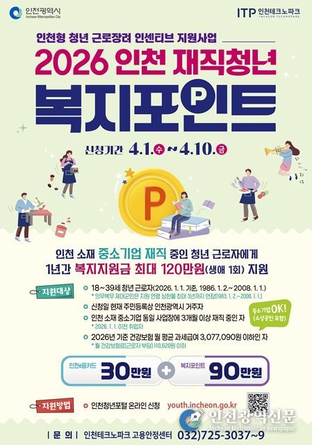 [인천광역신문] 관리자 기자 | 인천광역시는 중소기업 재직 청년들의 근로 의욕을 높이기 위해 ‘인천 재직청년 복지포인트 지원사업’의 참여자를 4월 1일부터 4월 10일까지 모집한다고 밝혔다.