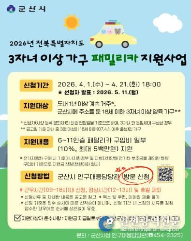 [인천광역신문] 관리자 기자 | 군산시는 다자녀 가구의 경제적 부담을 완화하고 이동 편의를 제공하여 저출생 위기를 극복하고자 ‘2026년 전북특별자치도 3자녀 이상 가구 패밀리카 지원사업’ 참여자를 모집한다고 밝혔다.