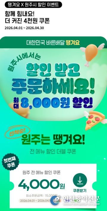 [인천광역신문] 관리자 기자 | 원주시는 4월부터 상생배달앱 ‘땡겨요’ 할인쿠폰 지원을 확대한다.