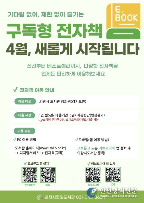 [인천광역신문] 관리자 기자 | 의왕시가 4월부터 시민의 정보 접근성을 높이고 디지털 독서문화 확산을 위해 ‘구독형 전자책 서비스’와 ‘온라인 학술 데이터베이스(DBpia) 서비스’를 도입한다.