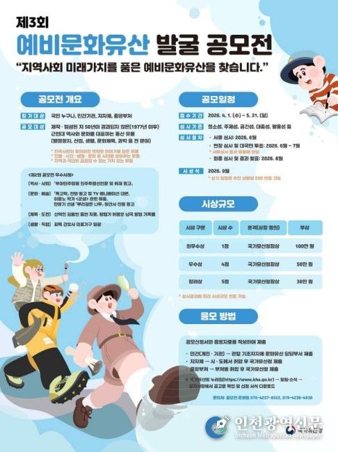 [인천광역신문] 관리자 기자 | 국가유산청은 4월 1일부터 5월 31일까지 근현대 한국 사회의 역사와 문화를 대표하고 국민이 공감할 수 있는 미래 문화자원을 발굴하기 위해 '제3회 예비문화유산 발굴 공모전'을 개최한다.