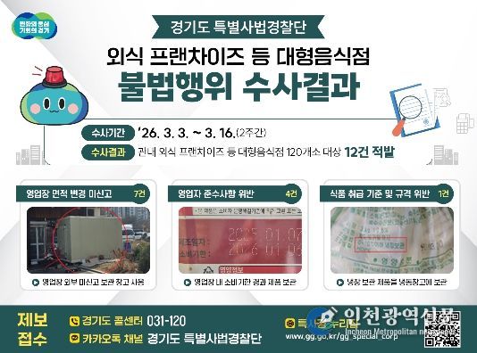 [인천광역신문] 관리자 기자 | 경기도 특별사법경찰단은 지난 3월 3일부터 16일까지 도내 외식 프랜차이즈 등 대형음식점 120개소를 대상으로 집중 수사를 실시한 결과 영업장 면적 변경 미신고 및 영업자 준수사항 위반 등 총 12건의 불법행위를 적발했다.