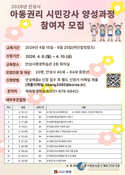 [인천광역신문] 관리자 기자 | 안성시는 아동친화도시로서 아동권리 인식 확산과 시민강사 양성을 위해 '아동권리 시민강사 양성과정' 참여자를 모집한다.