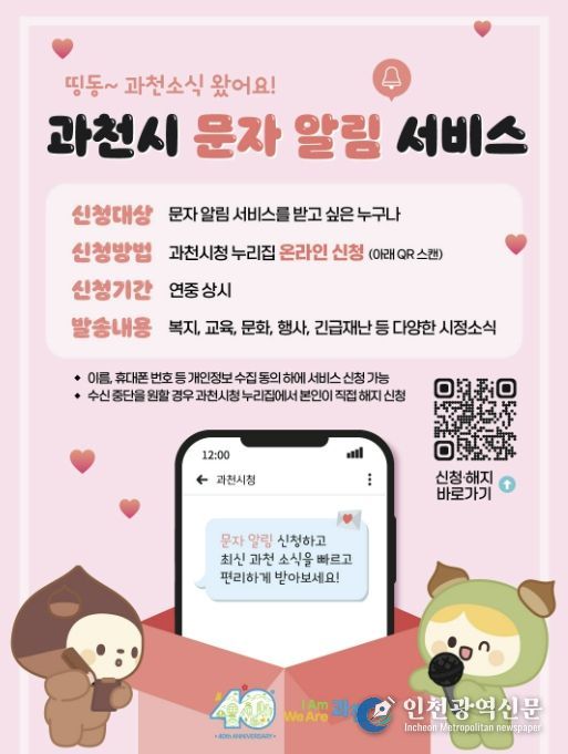 과천시 관계자는 “문자 알림 서비스를 통해 시의 다양한 소식을 시민들에게 적시에 제공되도록 소통을 강화해 나가겠다”라고 밝혔다.