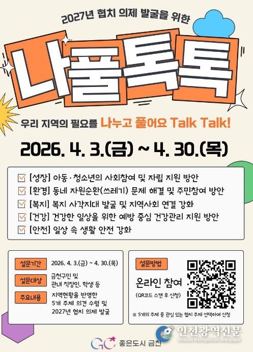 [인천광역신문] 관리자 기자 | 금천구는 4월 3일부터 30일까지 온라인 플랫폼을 통해 주민 참여형 공론장인 ‘나풀톡톡(나누고 풀어요 Talk Talk)’을 운영한다고 밝혔다.